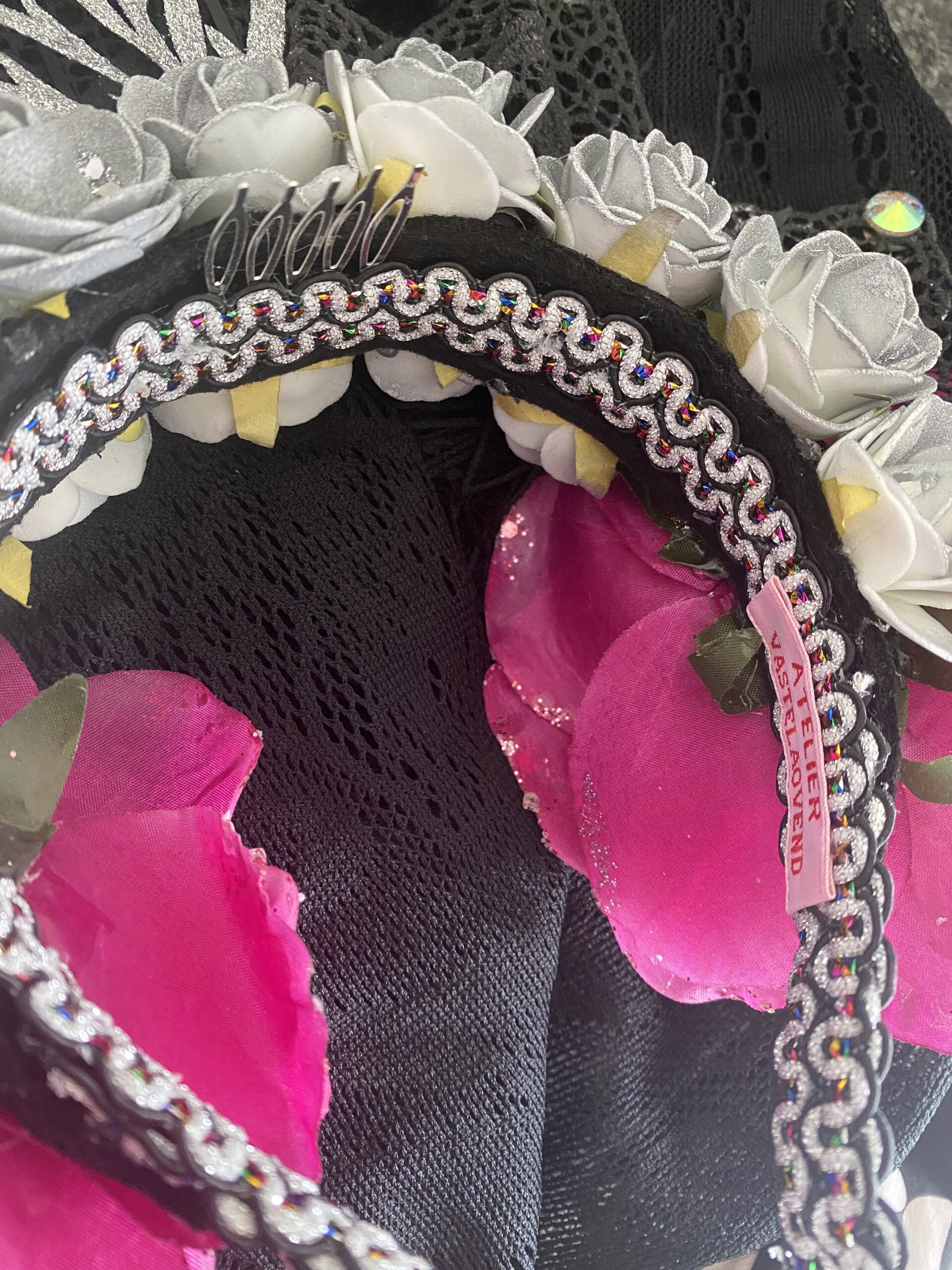 Day of the dead kroon op basis van een metalen diadeem met kammetjes om de haarband vast te zetten. Bloemen, kant, strass, glitters en een zilveren glitter takje in het midden.