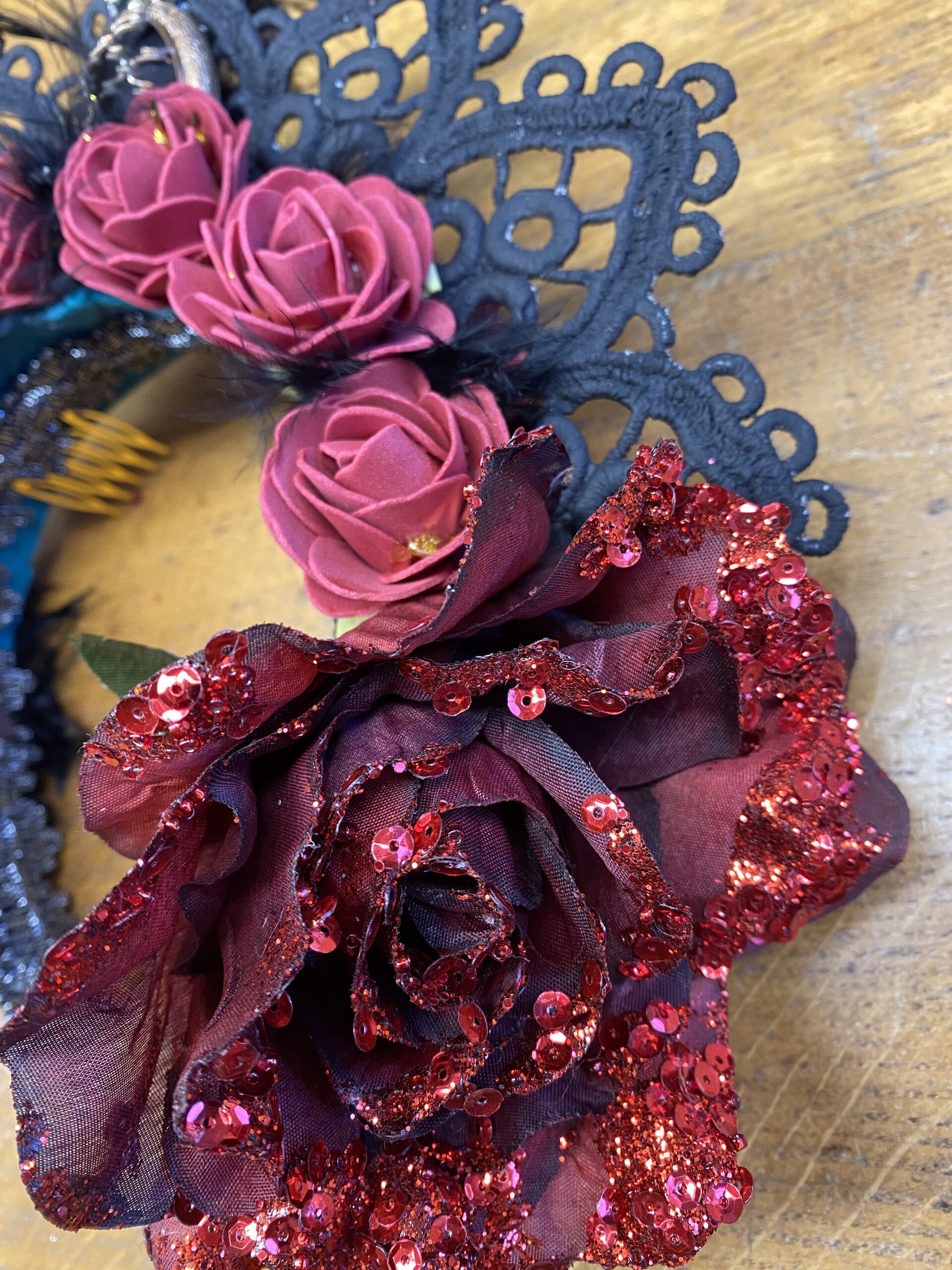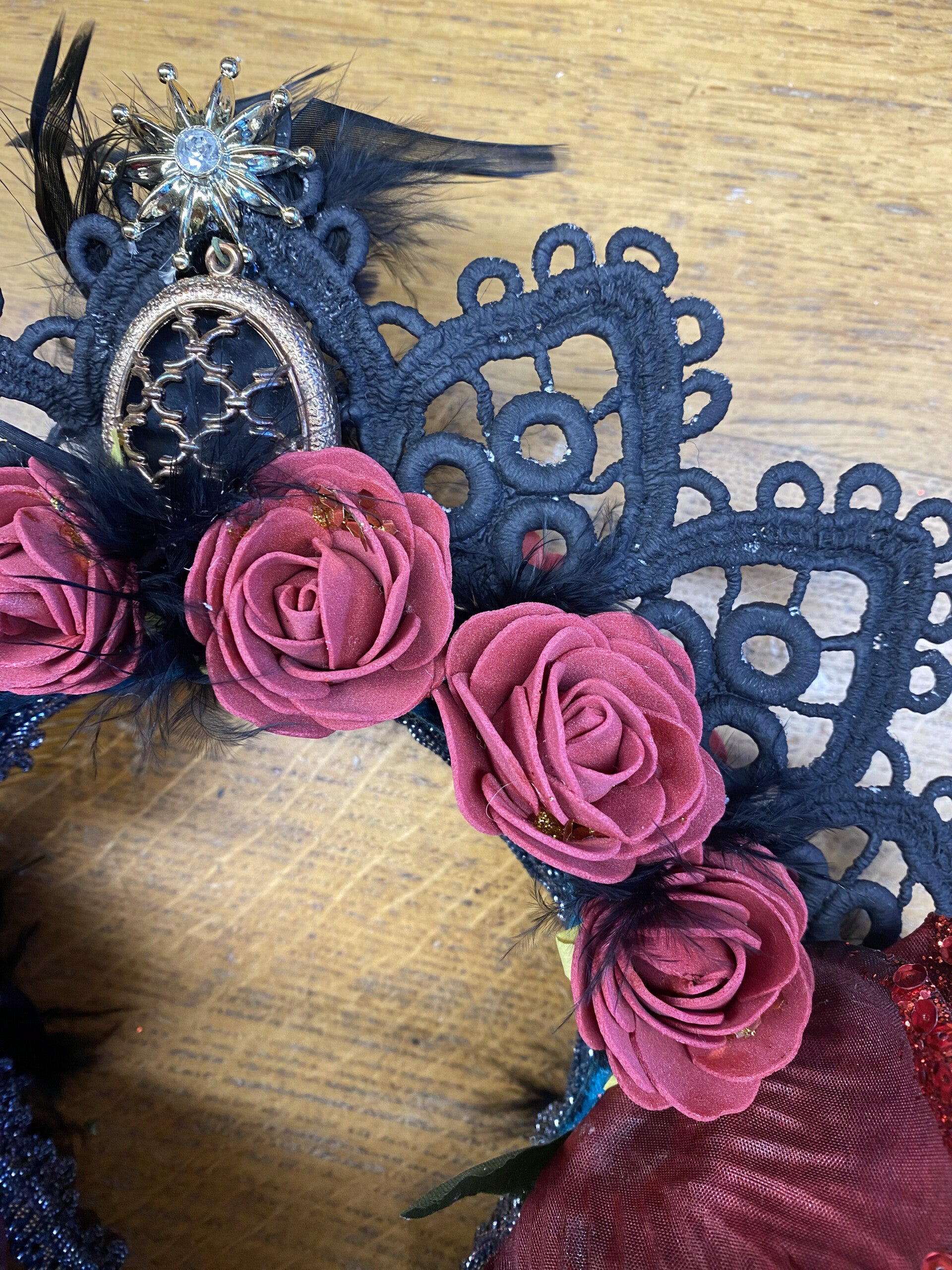 Day of the dead kroon op basis van een metalen diadeem met kammetjes om de haarband vast te zetten. Bloemen, kant, strass, glitters en een vintage sieraad in het midden.