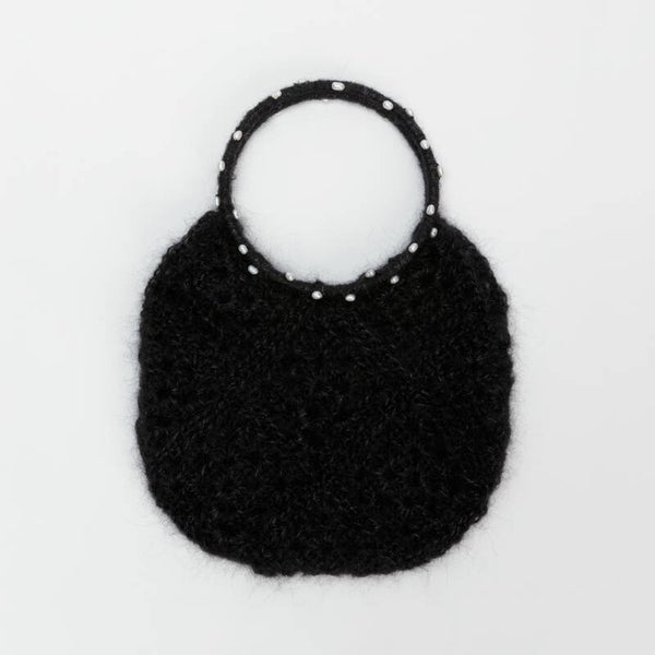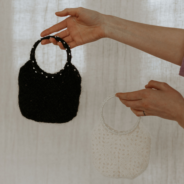 Beautiful crochet handbag in a fluffy mohair and silk mix with fresh water pearls detail on the 'bracelet' handles. Super cute for the bride or the bridesmaids! Hold your phone, lipstick and vows.